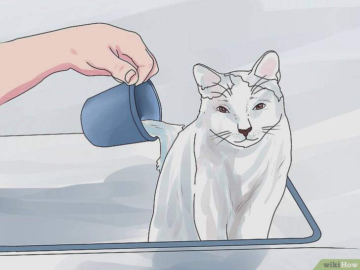 Thêm nước vào chậu: Khi mèo nằm trong bồn tắm bạn có thể lấy cốc hoặc vòi nước dội nhẹ cho đến khi bộ lông chúng ướt hoàn toàn. Hãy đổ nước thật nhẹ nhàng và âu yếm, vuốt ve chúng nhiều hơn để chúng luôn cảm thầy bình tĩnh. Nếu bạn có người trợ giúp, hãy nhờ họ giúp bạn giữ phần vai của chúng để bạn dễ dàng dội nước hơn. Mỗi lần dội chỉ nên dội từ nữa cốc đến đầy cốc và tránh dội vào mặt chúng.