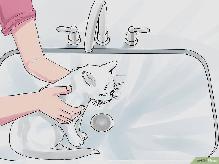 Chuẩn bị tắm cho mèo: Thường thì nơi phổ biến để tắm cho mèo sẽ là bồn rửa mặt hoặc bồn rửa chén, bởi vì tắm cho mèo trong chậu nhỏ bạn sẽ dễ dàng kiểm soát chúng hơn so với việc bạn để cho chúng tắm trong bồn tắm lớn. Có một số người thường thích đổ nước đầy bồn nước sau đó "nhúng" bé mèo vào. Điều này sẽ làm chúng trở nên hoảng sợ hơn, bạn nên áp dụng cách này vào bước cuối cùng. Thay vào đó bạn nên cho mèo vào bồn và từ từ dội nước ấm lên người để chúng có thể làm quen với việc tắm dễ dàng hơn. Ngoài ra bạn có thể đặt miếng lót bằng nhựa dưới bồn để mèo không bị trượt ngã hay bạn có thể đổ nước ấm đến khoảng 2,5cm để bàn chân của mèo nhanh chóng làm quen với nước.